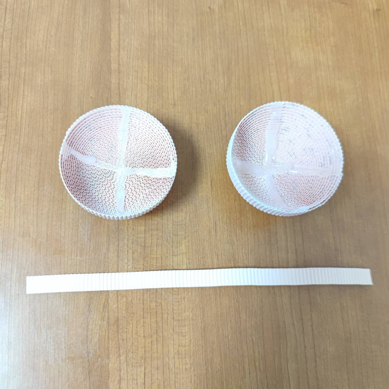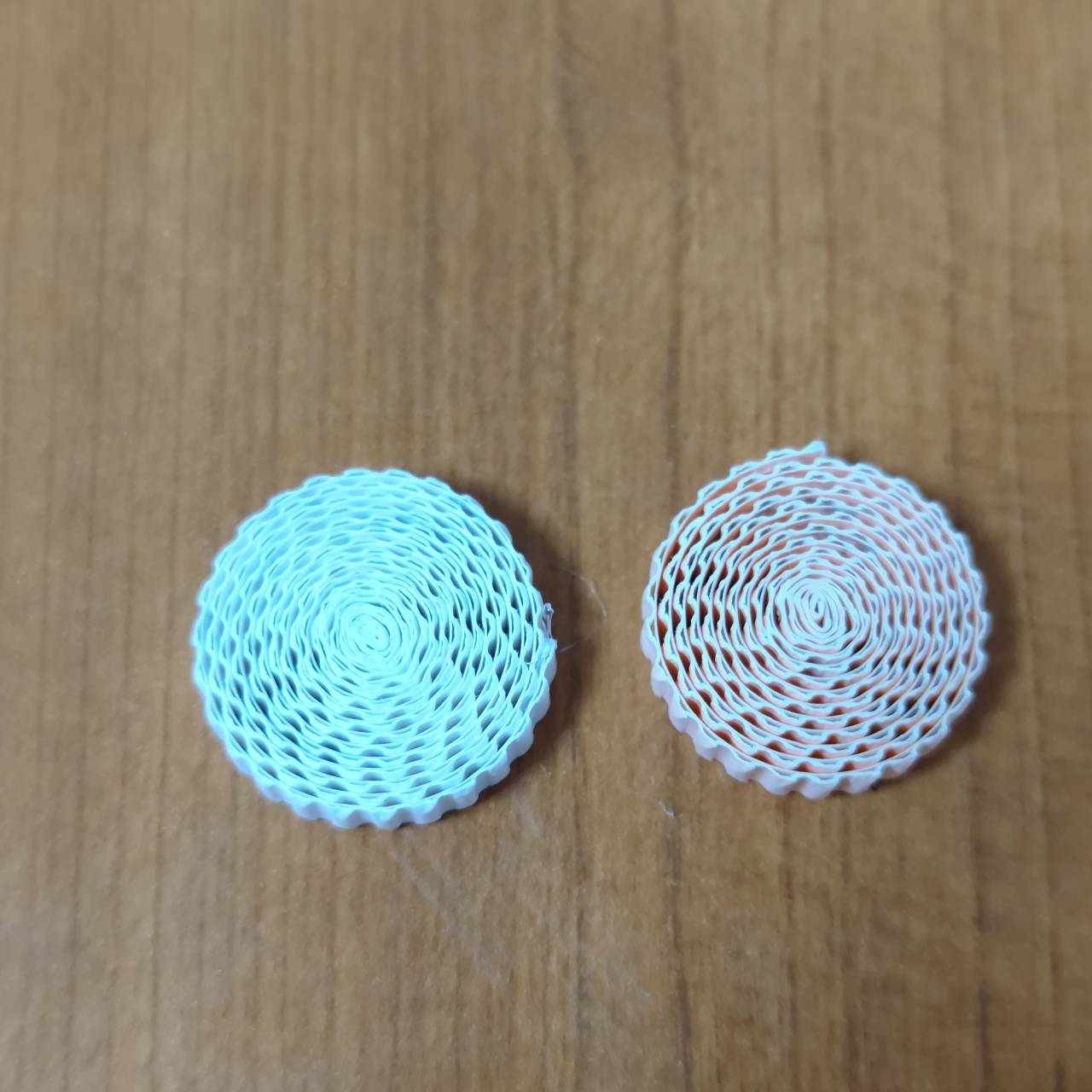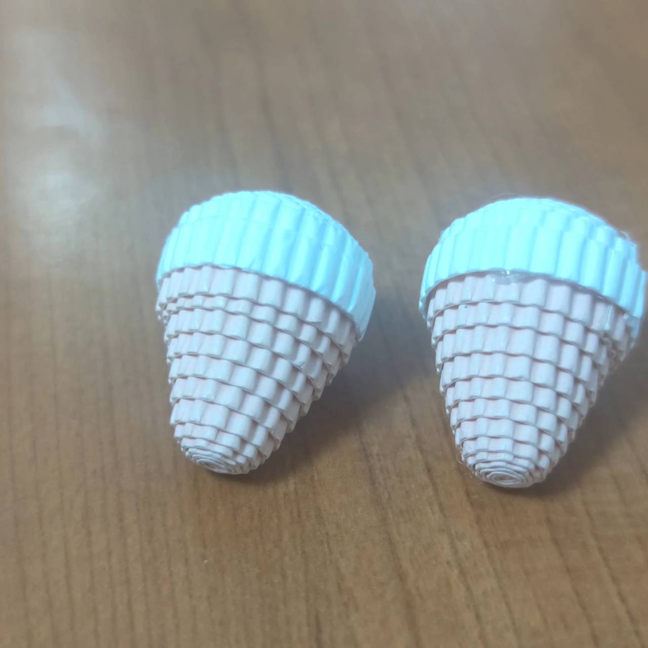 手臂:将手臂的纸卷卷成两个纸饼。取卷好的两个纸饼,肤色纸饼推高2厘米,白色纸饼推高1厘米,凹面处打胶待干固定。肤色和白色两个半圆用密合线组合成球体,手臂完成。